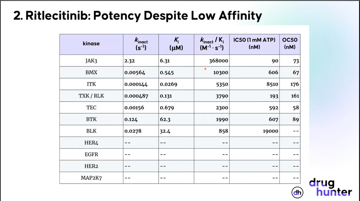 Ritlecinitib (Litfulo) is a covalent JAK3/TEC kinase family inhibitor, developed by Pfizer, for the treatment of alopecia areata, an autoimmune condition causing hair loss. The goal of the compound was to selectively inhibit JAK3, a task it doesn’t look very good at doing based on Ki alone. When you look at kinact and kinact/Ki, however, things look much more promising. The general takeaway is to be wary of a covalent drug developer spending too much time discussing binding affinity alone.45