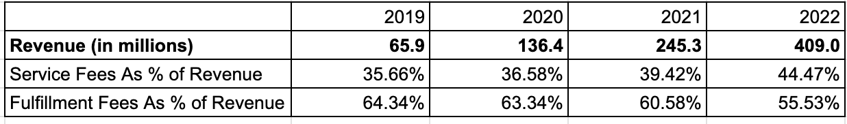 The balance between Global-e’s fulfillment and integrated platform revenue has shifted over the past four years as its customer mix has changed:
