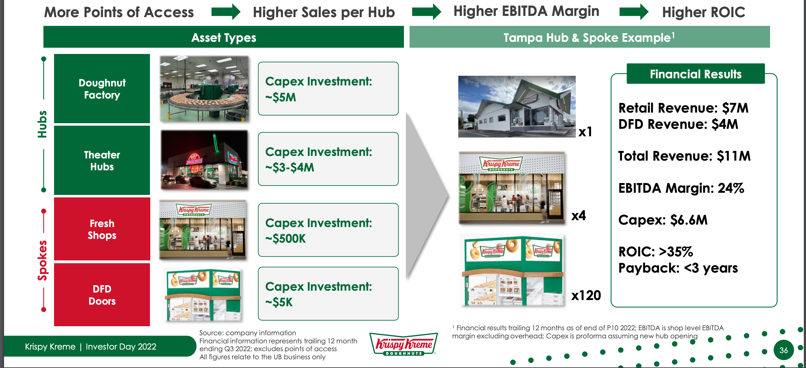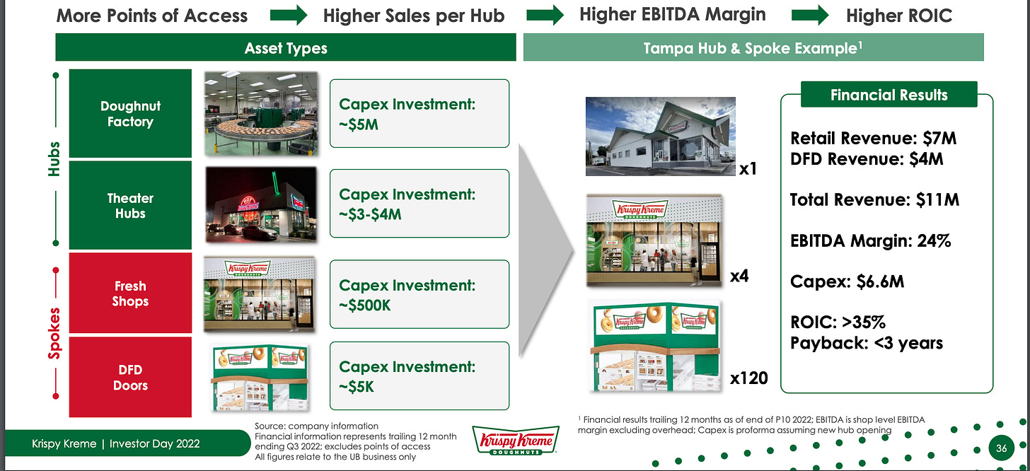 Krispy Kreme ended up choosing a blend of both these options, which it terms the “Hub and Spoke Model”, and is best described by the following slide: