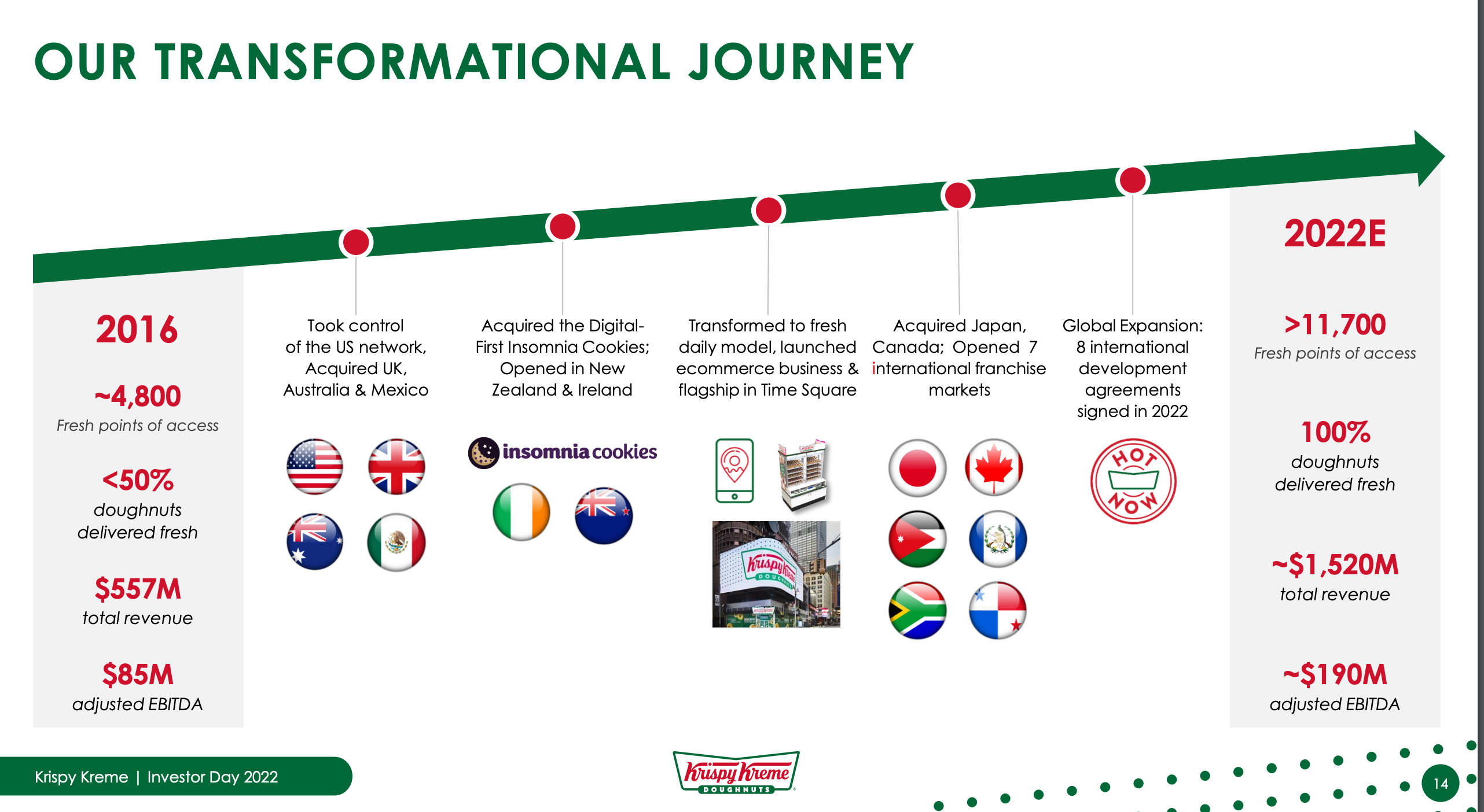 In 2016 Krispy Kreme was taken private by JAB, a holding company that invests in consumer goods and services businesses. Krispy Kreme spent the next 5 years rethinking its business strategy, and then went public again in the summer of 2021. Its pivot was well defined in the company’s S1: